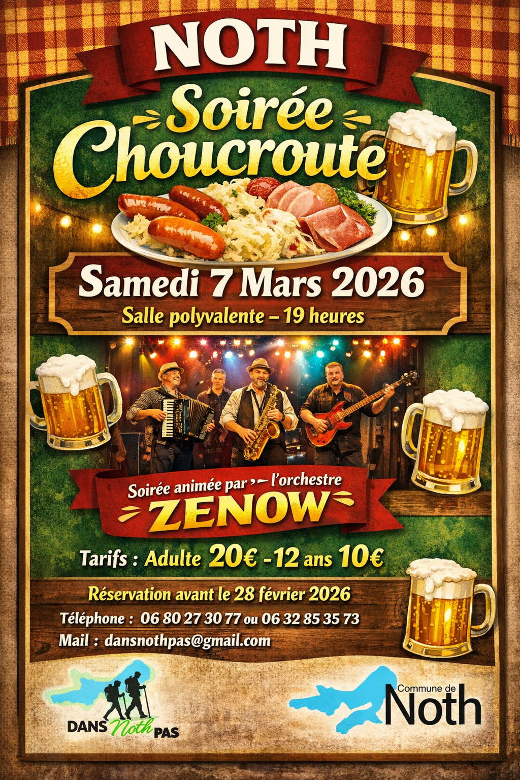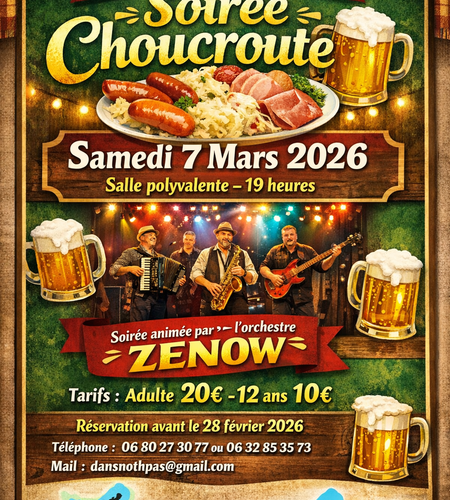 L’association DANS NOTH PAS vous propose une soirée choucroute le Samedi 7 mars 2026 dès 19h00 Animation assurée avec le groupe ZENOW