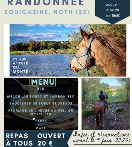 Randonnée équestre sur le Circuit EquiCazine suivi d’un repas ouvert à tous "Saucisses Aligot" Dimanche 15 JUIN 2025 Organisé par LA MARCHE AU TROT, sur l’ancien stade de la Cazine